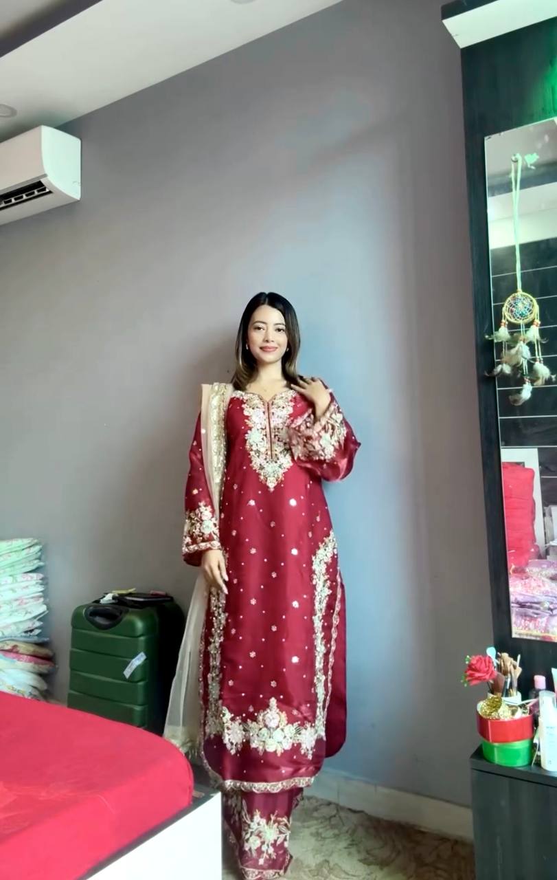 Make a bold and unforgettable statement in this crimson red embroidered suit set, a perfect ensemble for festive occasions, weddings, and grand celebrations. Featuring luxurious embroidery with golden zari and sequin work, this look is both regal and radiant — a timeless favorite for every wardrobe.