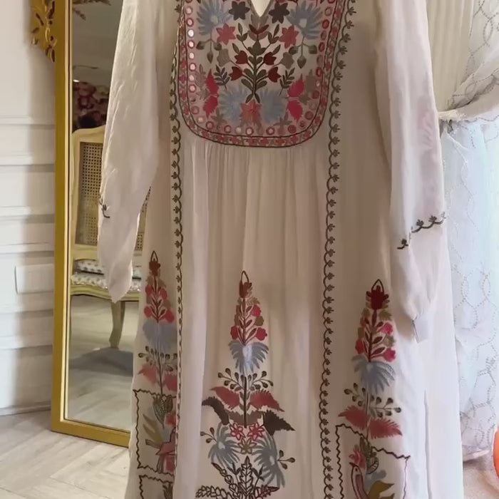 Front-open A-line style kameez with embroidered floral and bird motifs