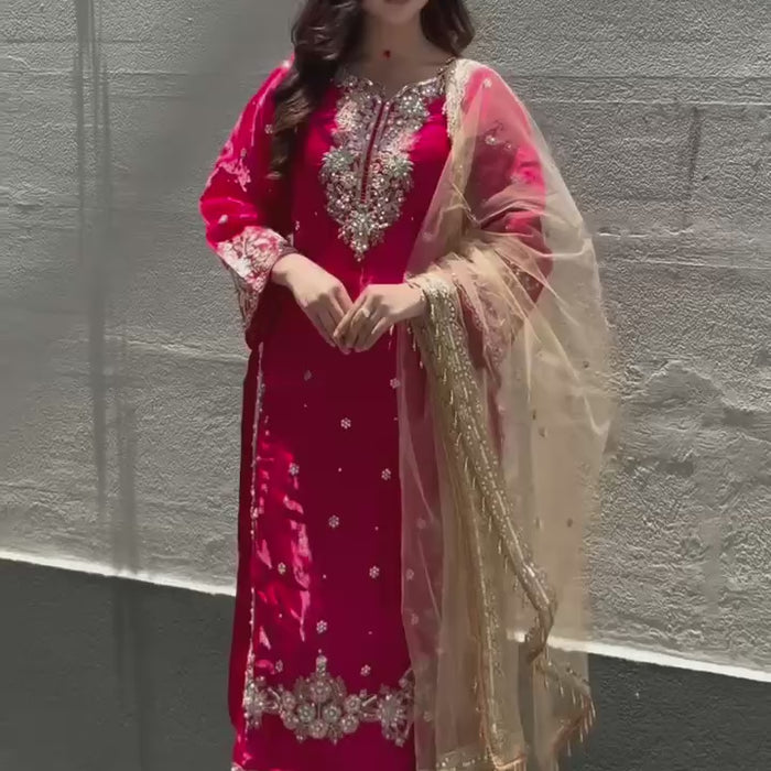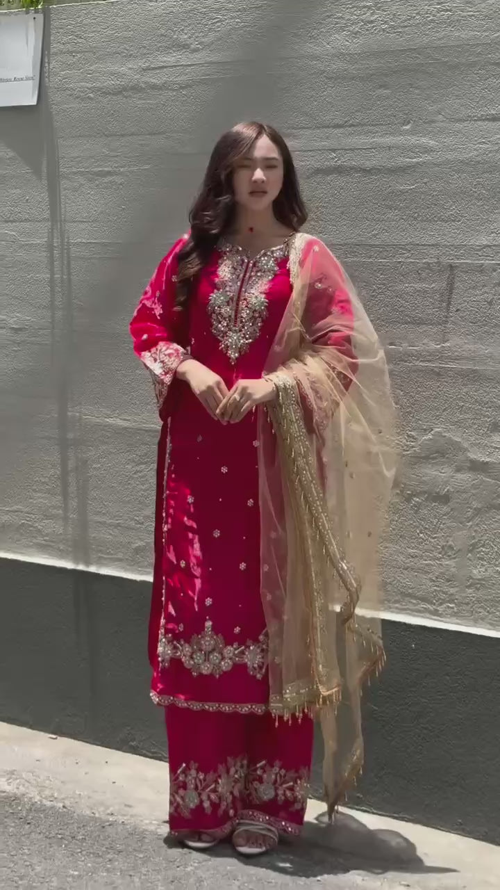 Make a bold and unforgettable statement in this crimson red embroidered suit set, a perfect ensemble for festive occasions, weddings, and grand celebrations. Featuring luxurious embroidery with golden zari and sequin work, this look is both regal and radiant — a timeless favorite for every wardrobe.
